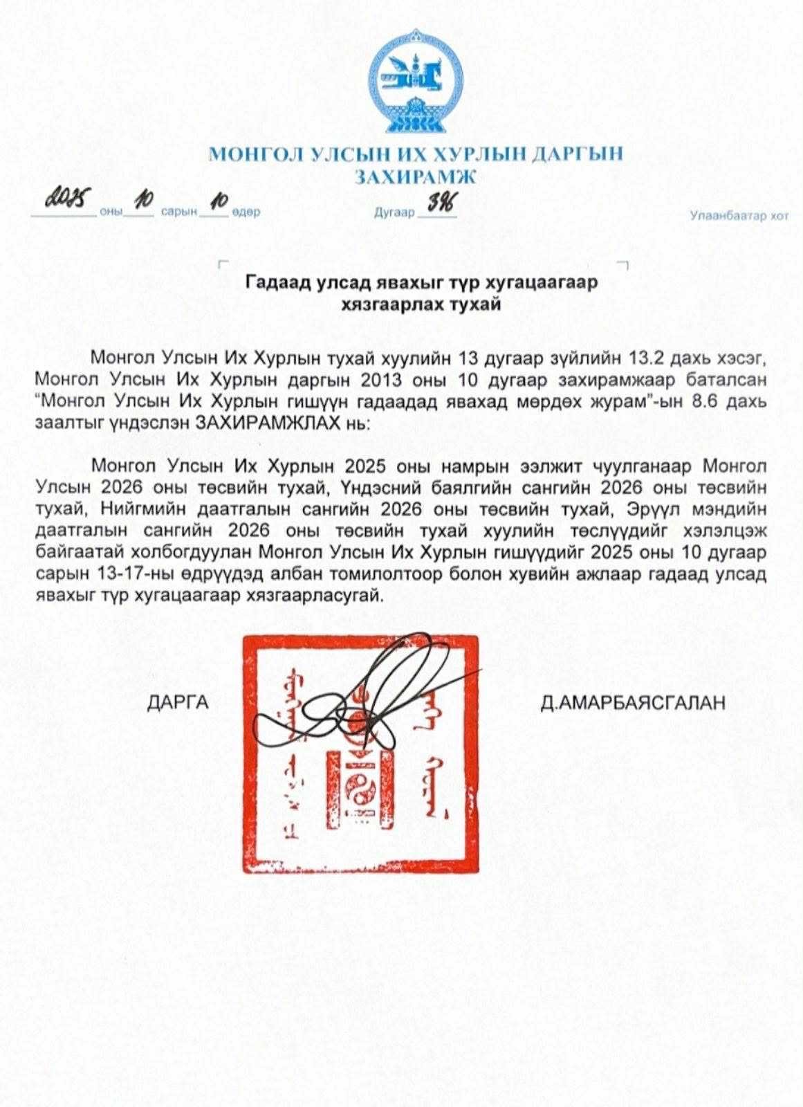 Захирамжийн агуулга нь, УИХ-аар 2026 оны Улсын төсөв хэлэлцэж буйтай холбогдуулан УИХ-ын гишүүдийг 2025 оны 10-р сарын 13-17-ны өдрүүдэд албан томилолтоор болон хувийн ажлаар гадаад улсад явахыг түр хугацаагаар хязгаарласуй гэжээ.